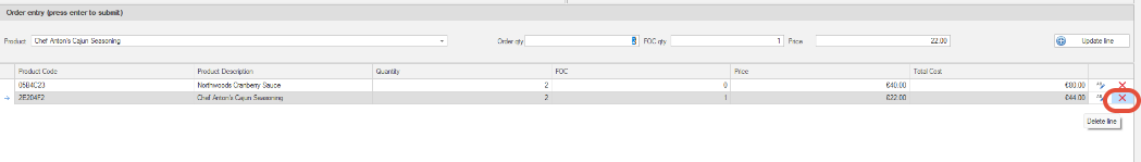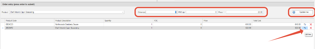 - To edit a product, click the Edit Line icon. Make changes in the highlighted fields, then select Update Line to save.