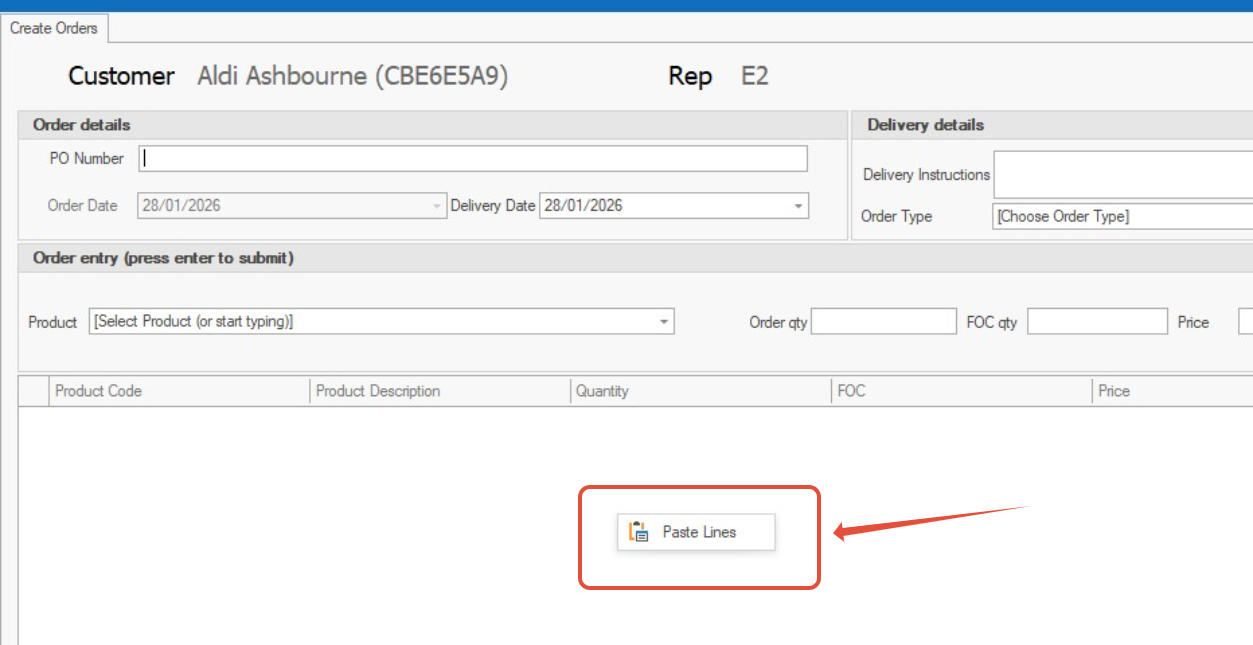 (You need the Product Code and Quantity. Price is optional and if it isn't supplied the price list price is used.) - Right-click in the Order Entry and select 'Paste Lines' .