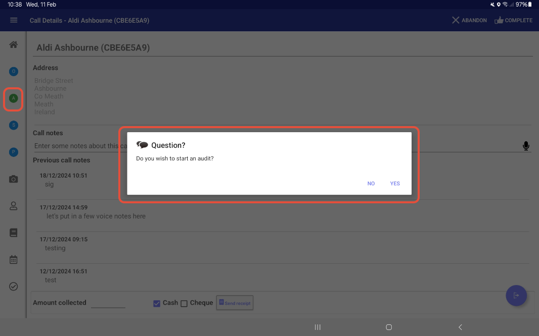 While in a call, tap the Audits tab by selecting the “A” icon on the left-hand side.