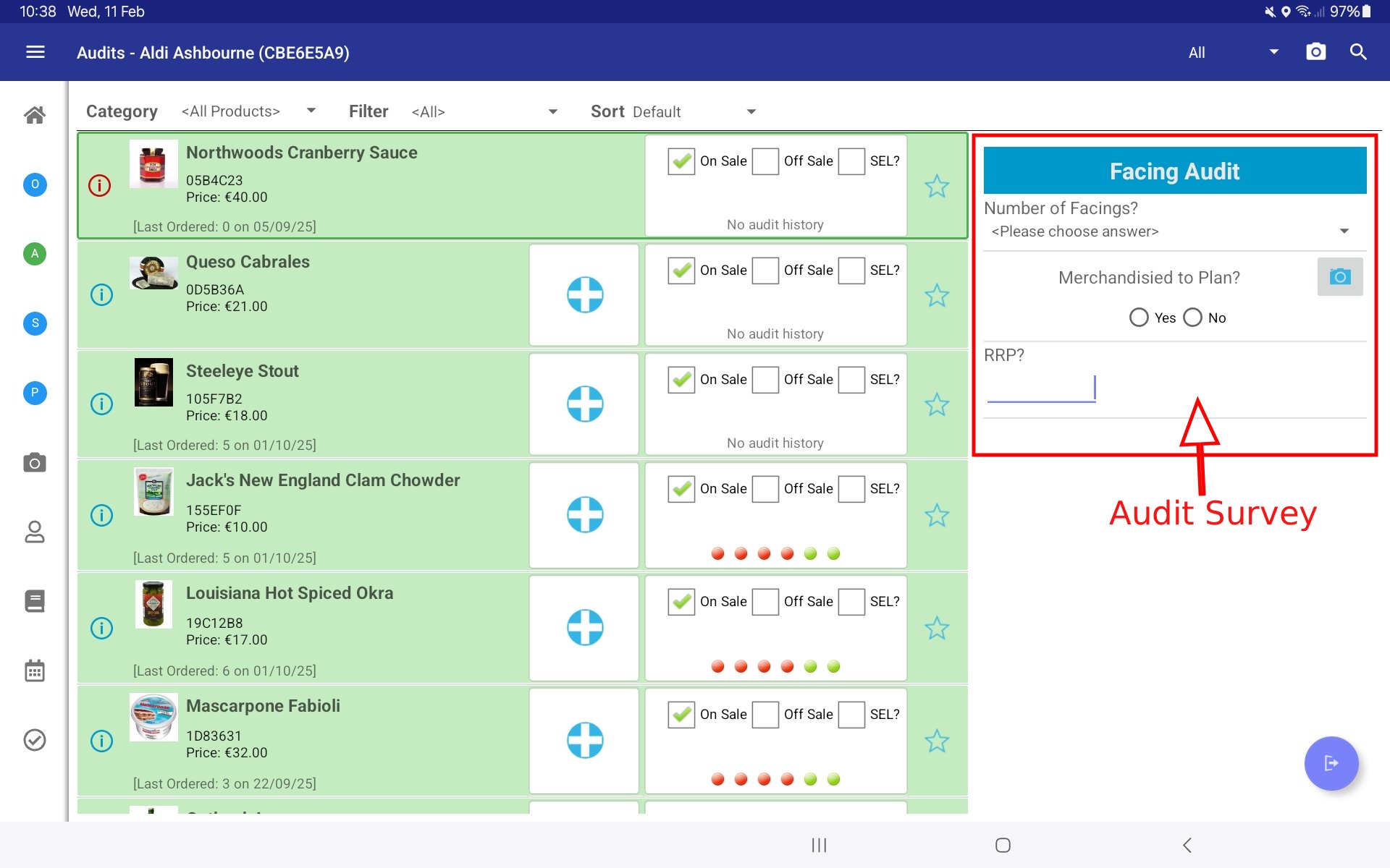 If an Audit Survey is configured, its questions will appear for that product on the right.