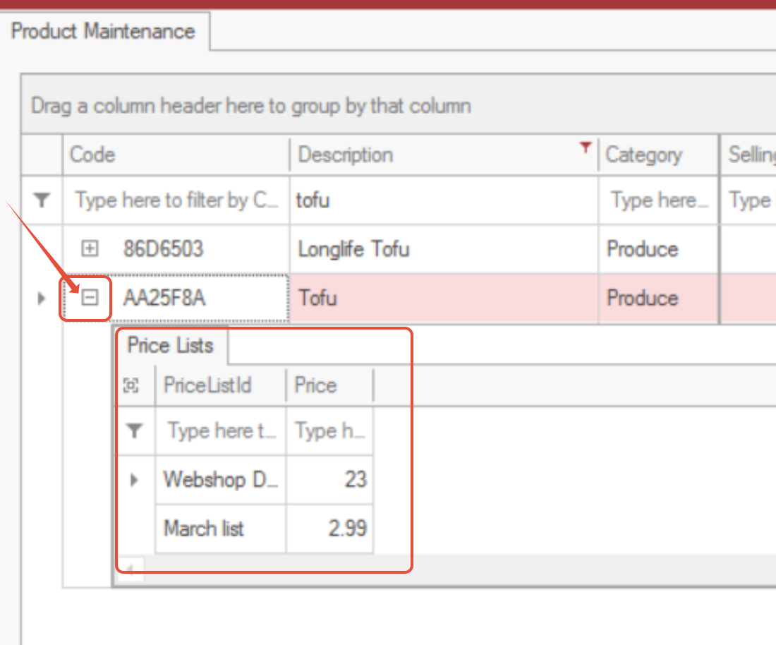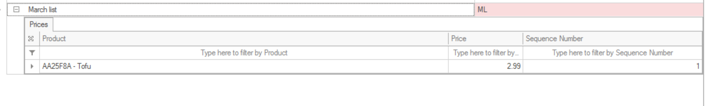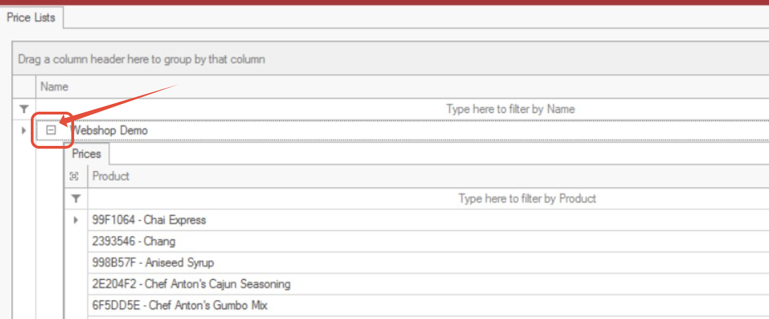 Expand the + icon to view all products included in a price list.