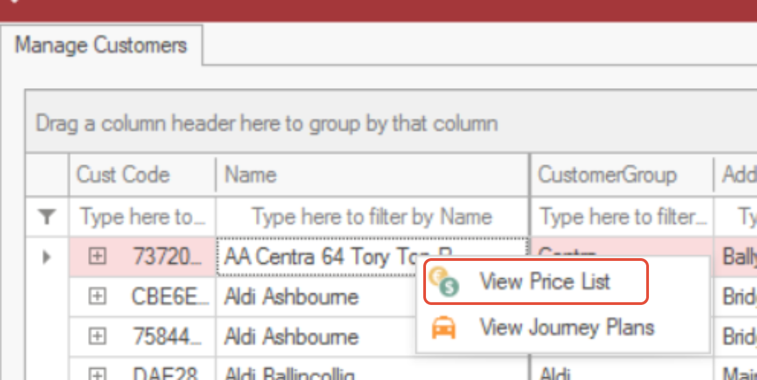 Right-click the customer and select View Price List.
