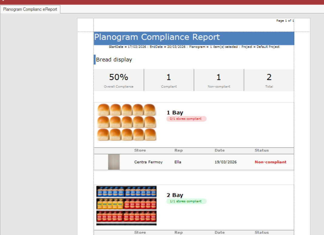 The results will display on screen, including the planogram image, the photo taken by the rep, and the compliance status.