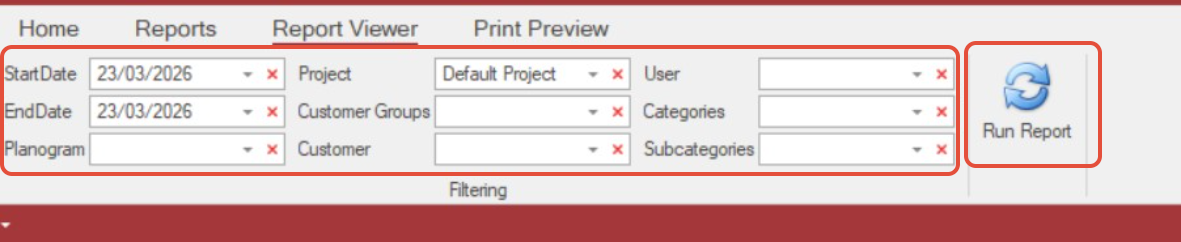 Select a Start Date and End Date in the filters panel, select the Planogram name from the dropdown-menu etc. then click Run Report.